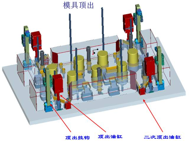 (1)第一級頂出采用4個油缸頂出同前模同步運動頂出60MM,4個拉鉤為輔助機構;
