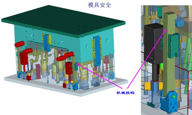 為了保證開模時斜頂跟前模一起同步運動,以使產品變形而脫模,當頂出機構同前模同步運動60MM后, 前/后模部分分離,這樣保護了模具,也保證了產品不會被拖傷!
